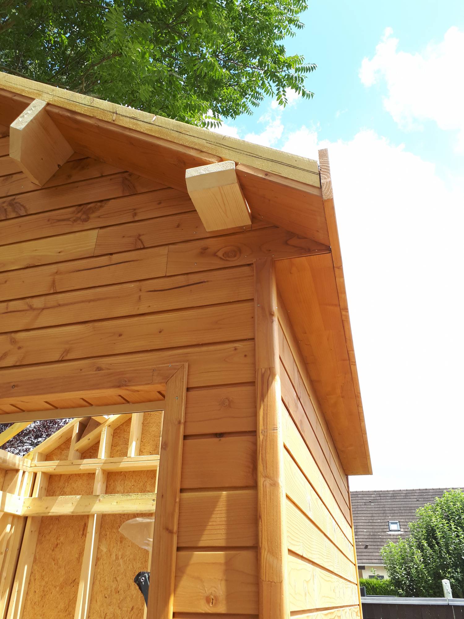 L'abri de jardin en bois de 9 m² (ci-contre) est en bardage douglas de coloris miel et habillé de menuiserie en Aluminium RAL 1015.