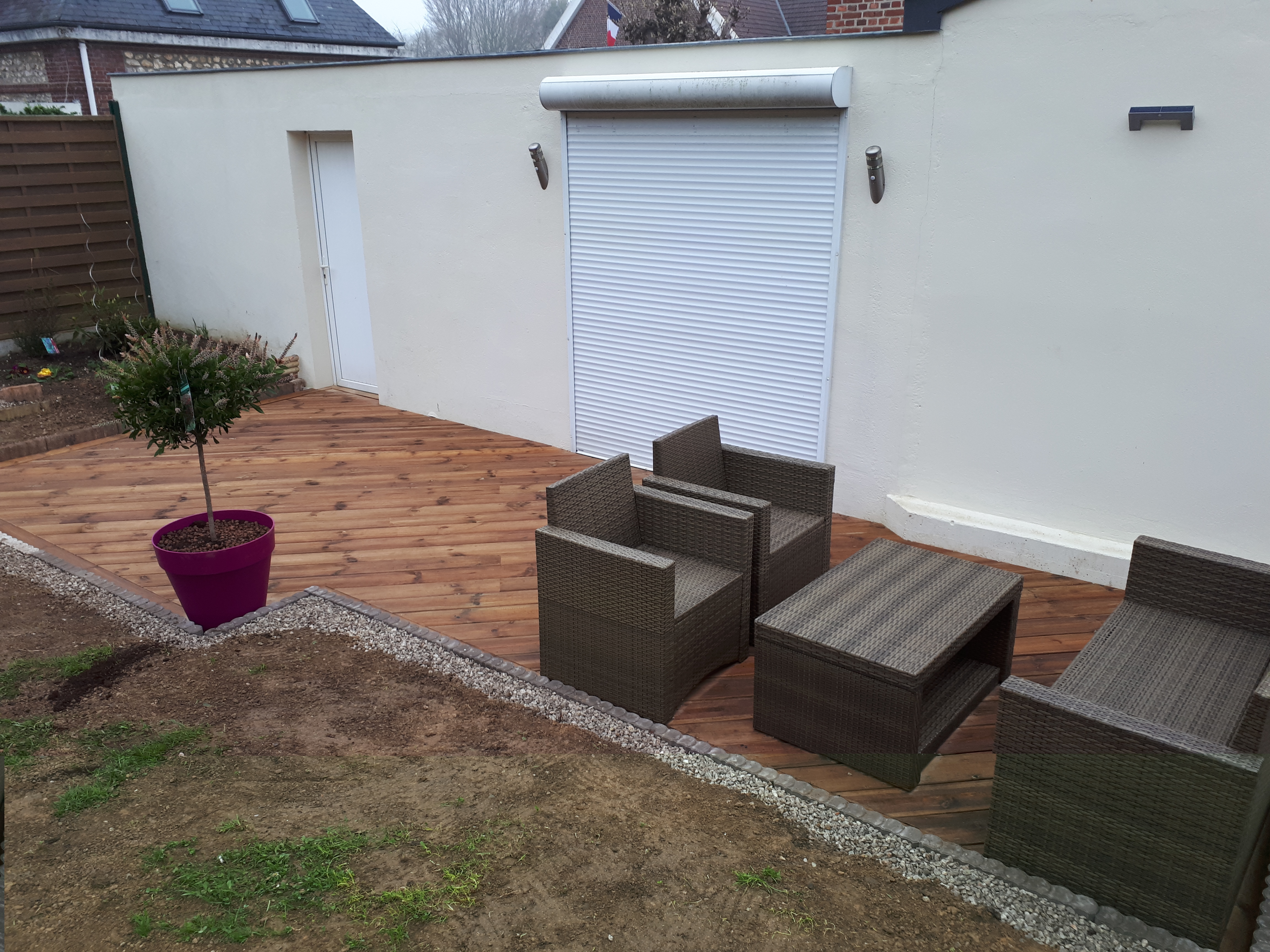 La terrasse présentée ci-contre est fabriquée en bois autoclave classe4 de couleur marron.