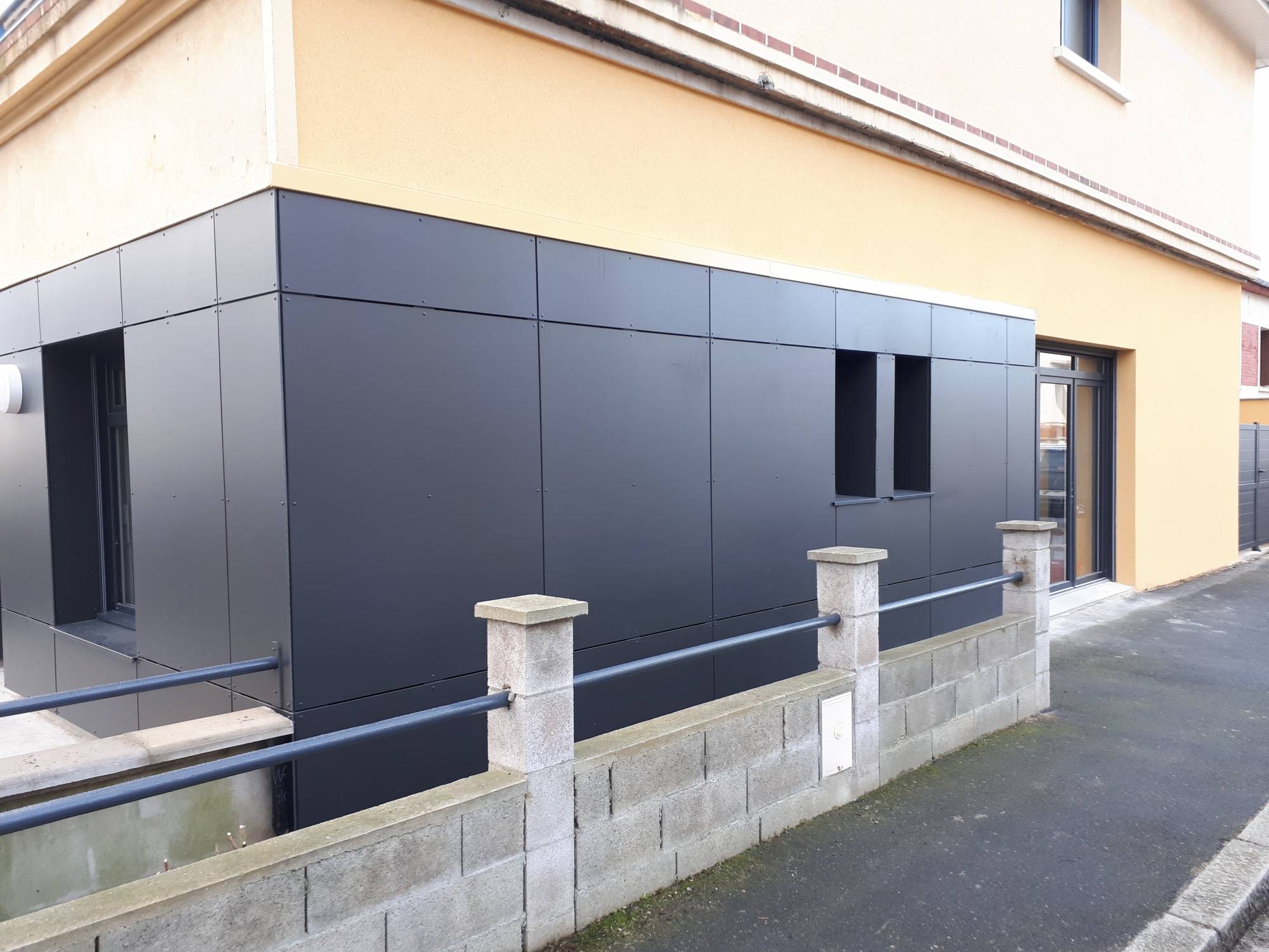 Cette technique est idéale pour les systèmes de façades ventilées, bardage en panneau compact 8 mm Polyrey gris anthracite.