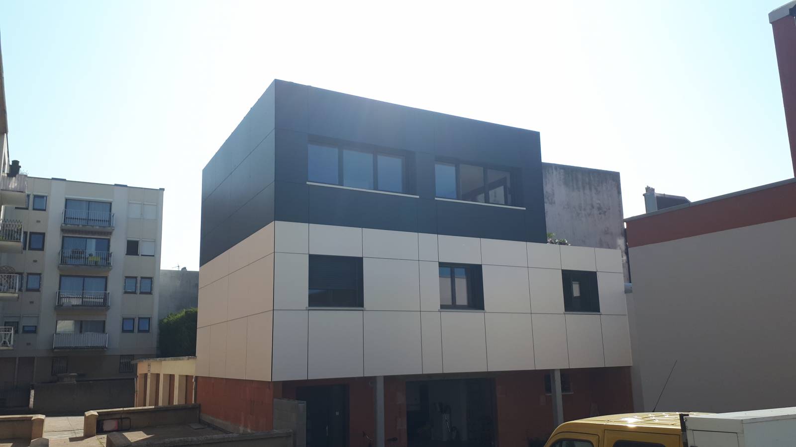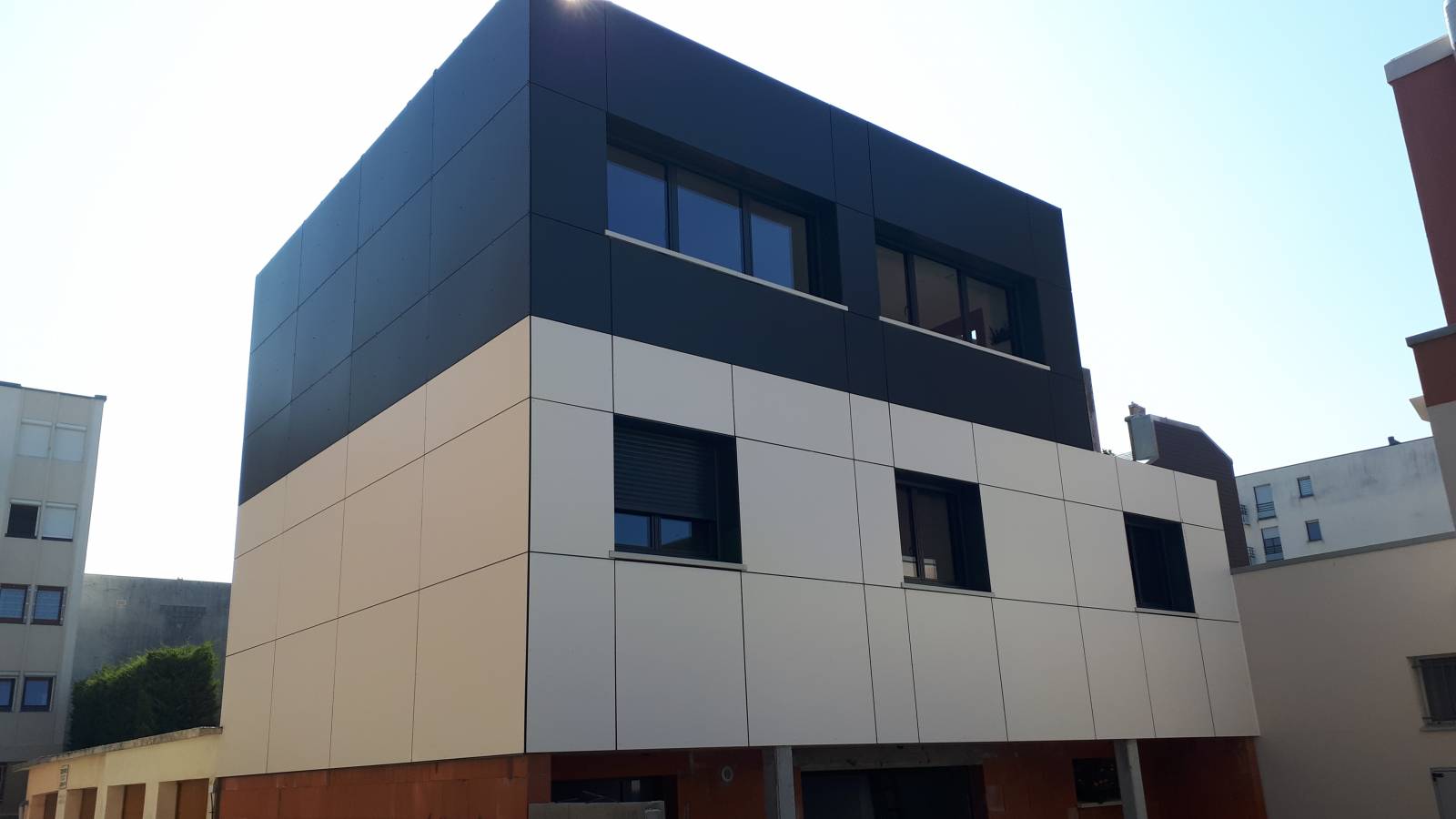 Un large choix de coloris vous seront proposés - Sur la façade présentée, notre client à choisi un coloris anthracite uni New-York Grey et pour les sous-faces un blanc cassé uni-blanc papyrus. L'harmonie de ces deux couleurs se marie très bien avec le style de la maison -