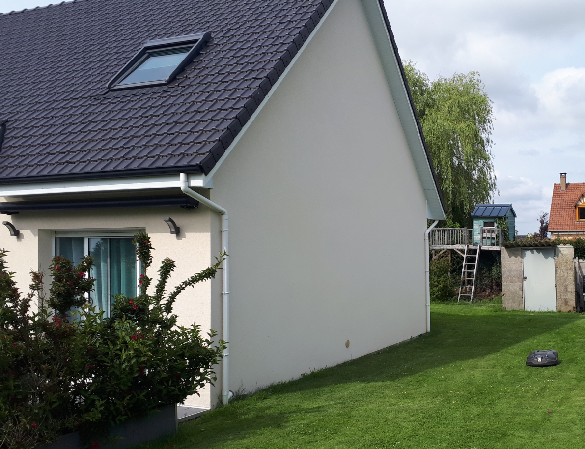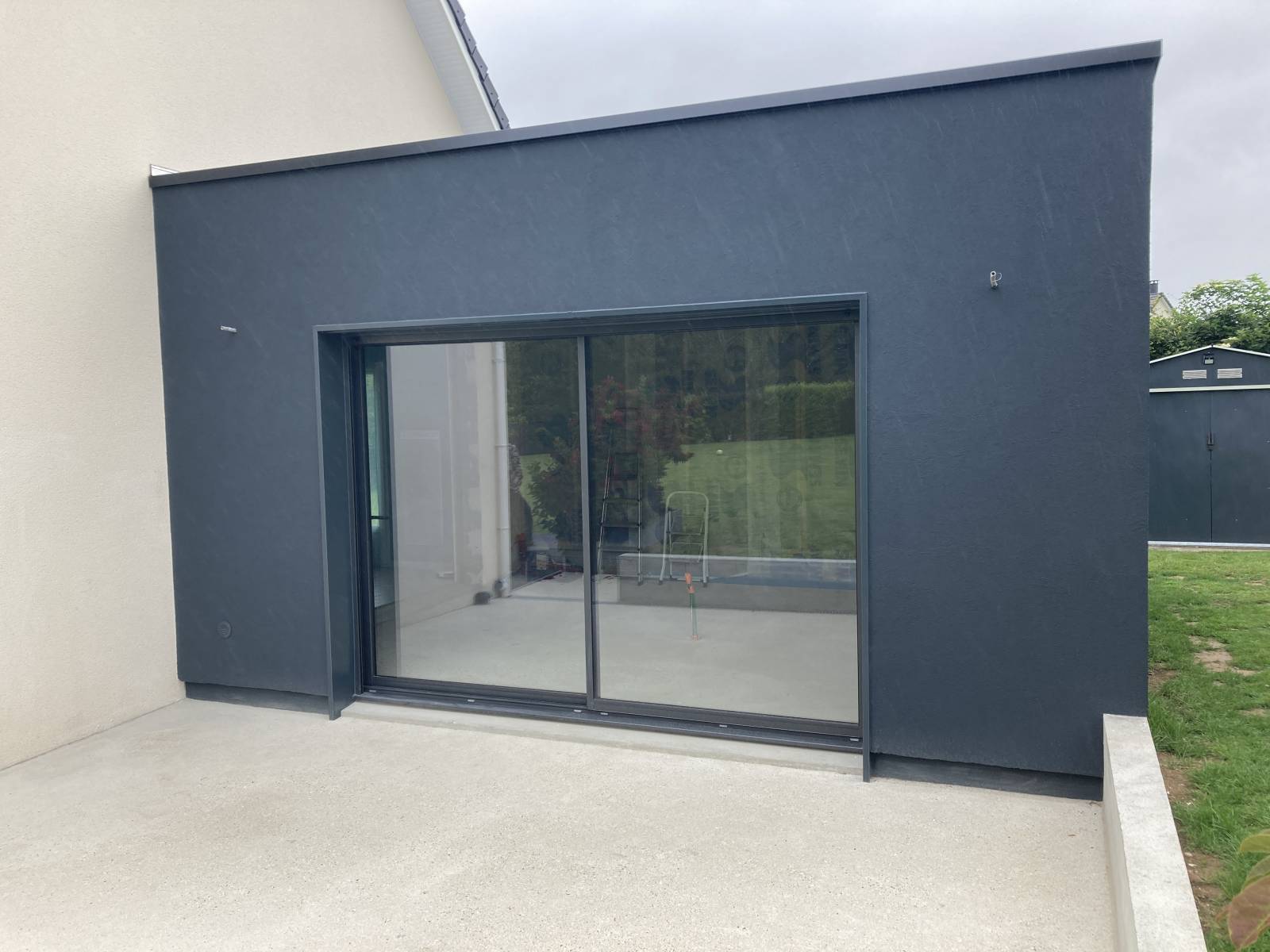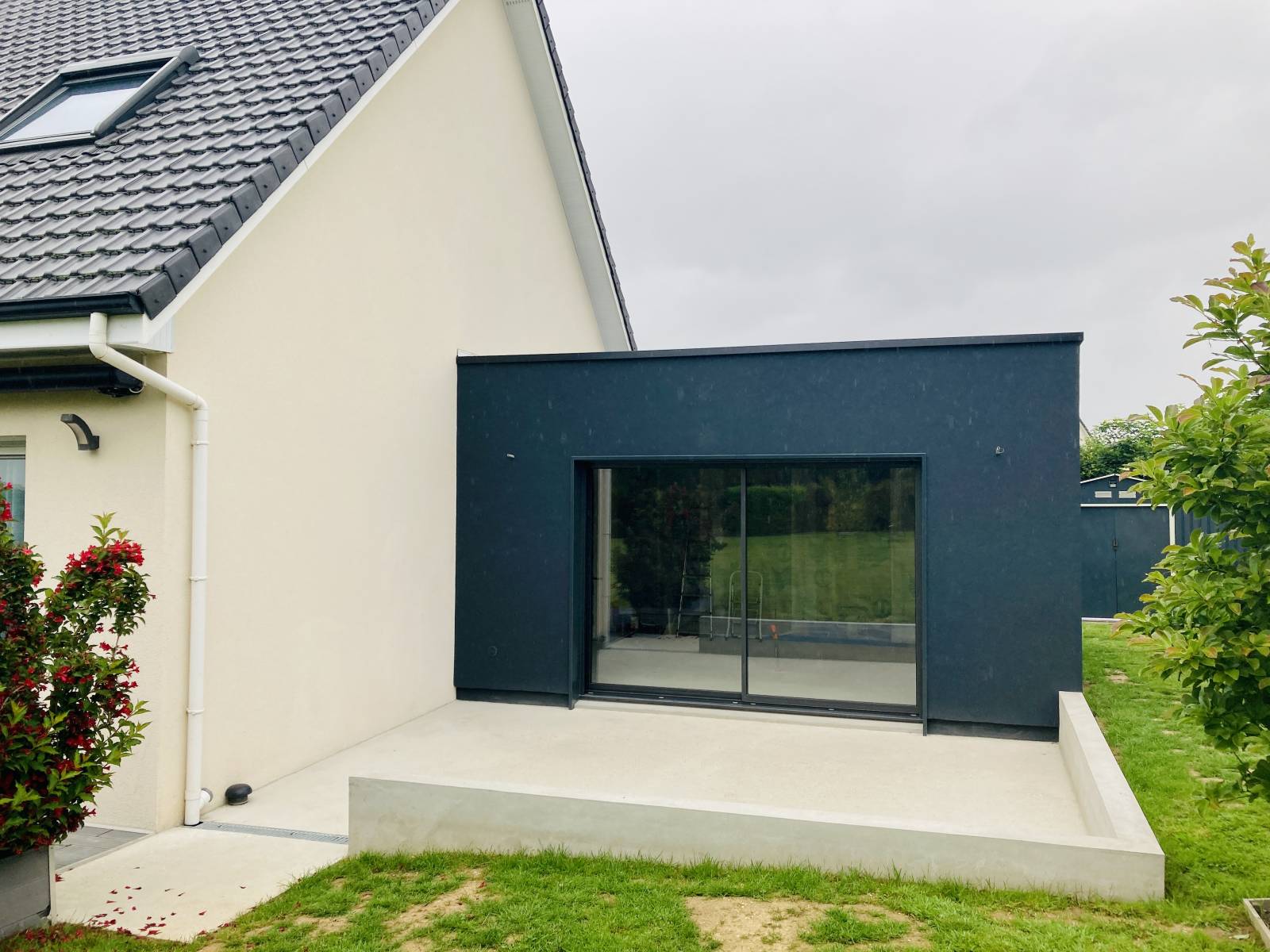 Pour s'accorder au ravalement de votre maison existante, L'Atelier au Fil des Copeaux spécialiste de l'agrandissement de maison en bois dans la région du Havre, vous propose cette extension en ossature bois avec une finition enduit gris foncé.