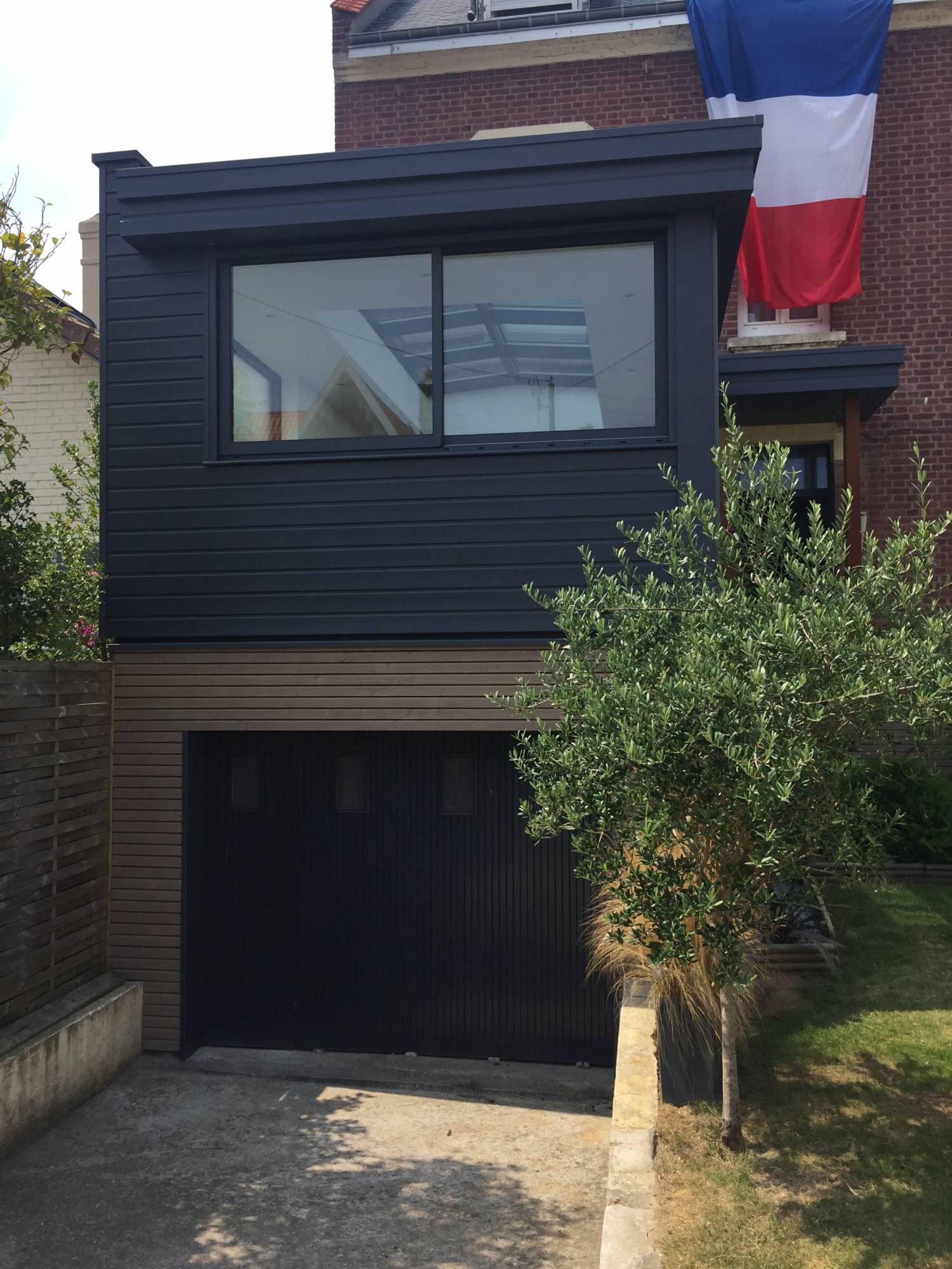 L'extension ci-contre est un Espace2vie en aluminium gris anthracite. Deux coloris de bardage sont présentés : gris 102 et gris anthracite.