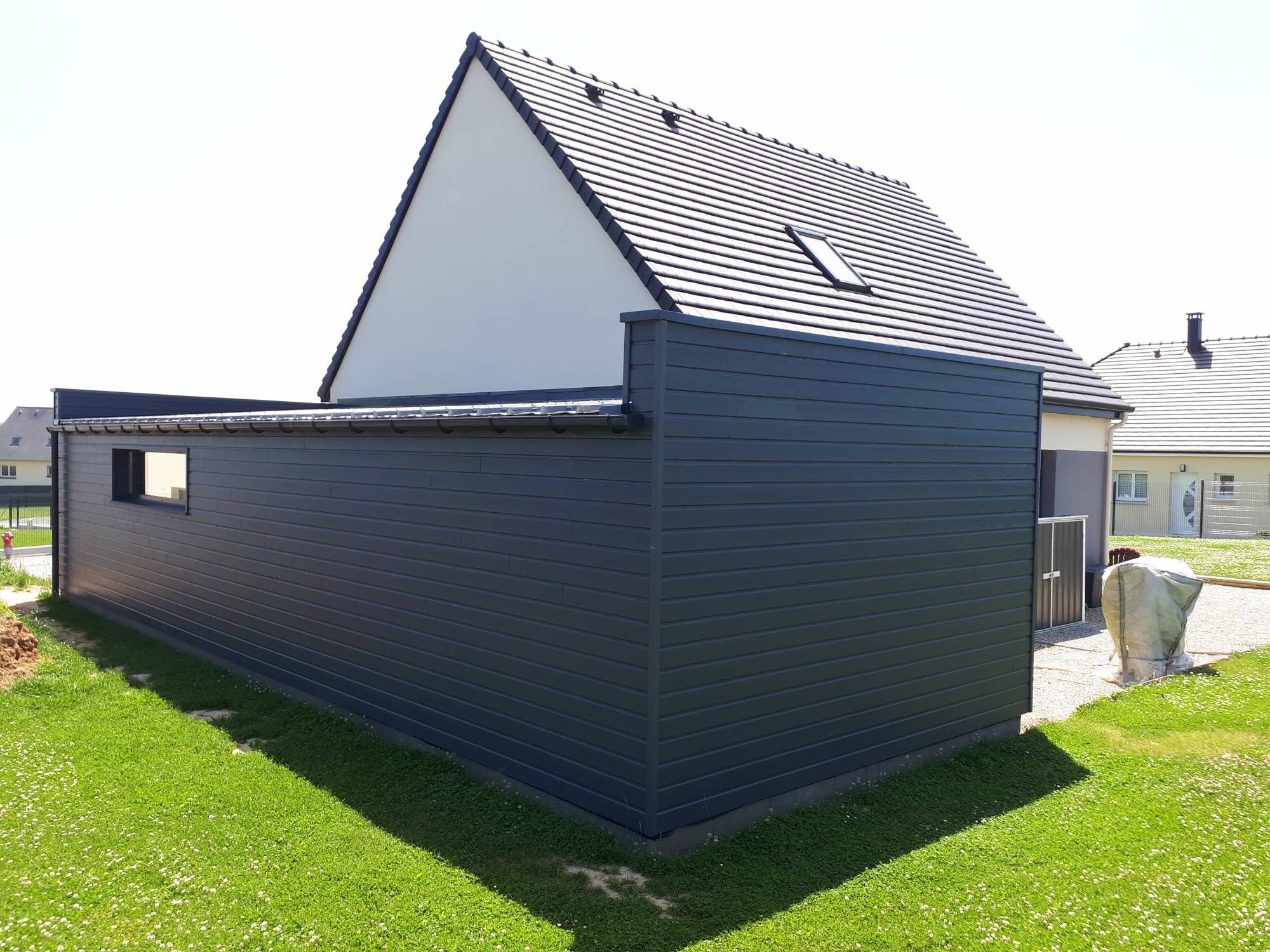 La réalisation ci-contre est composée d'un bardage bois anthracite, d'une couverture bac acier et d'une porte de garage sectionnelle.
