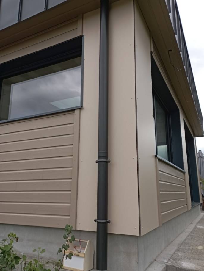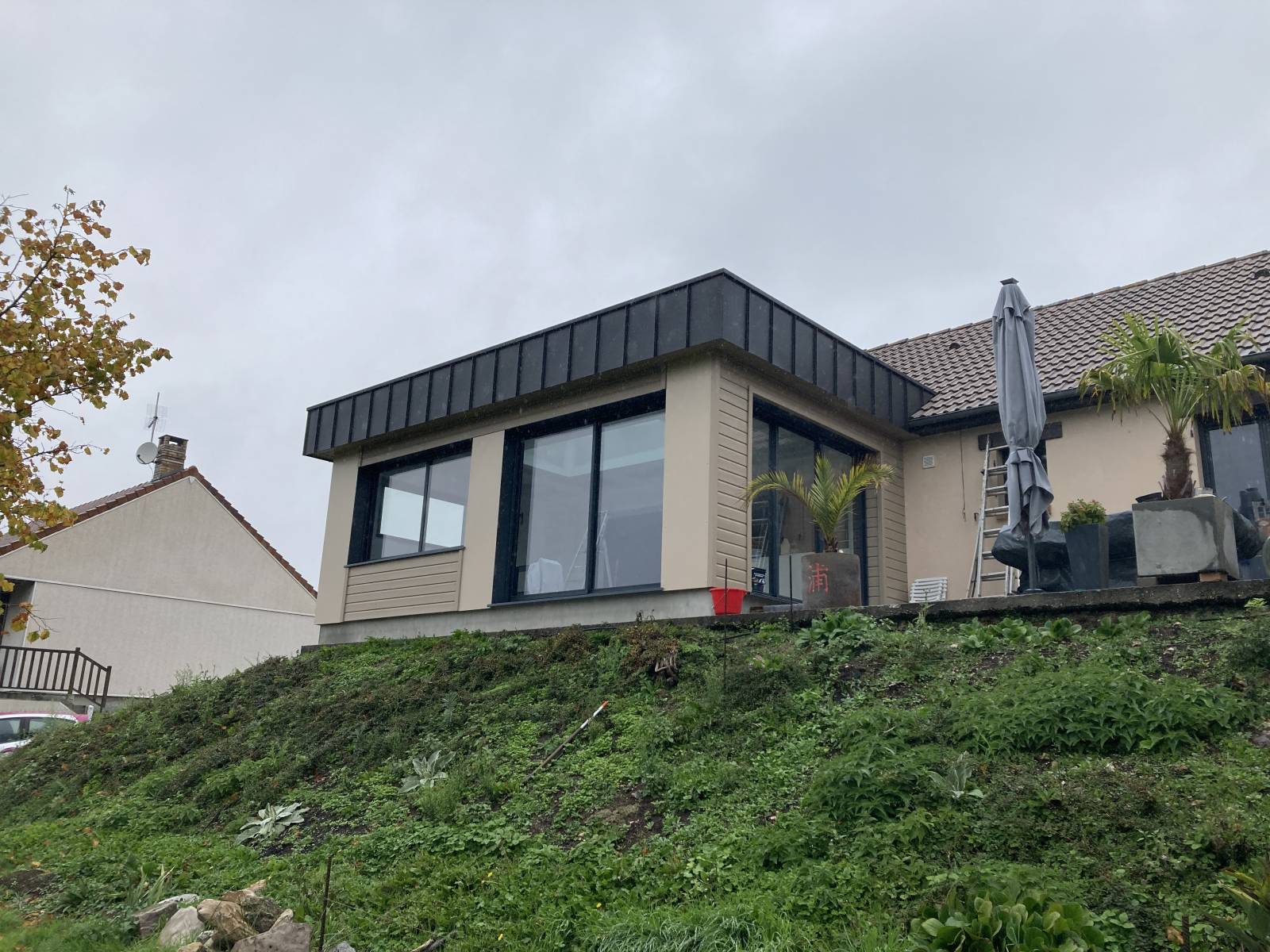 Cette extension de maison en bois est composé d'un bardage Canopé en sapin du nord, de menuiseries en aluminium Monocouleur Gris 7016 et d'un bandeau en zinc s'harmonisant parfaitement avec le style de la maison.