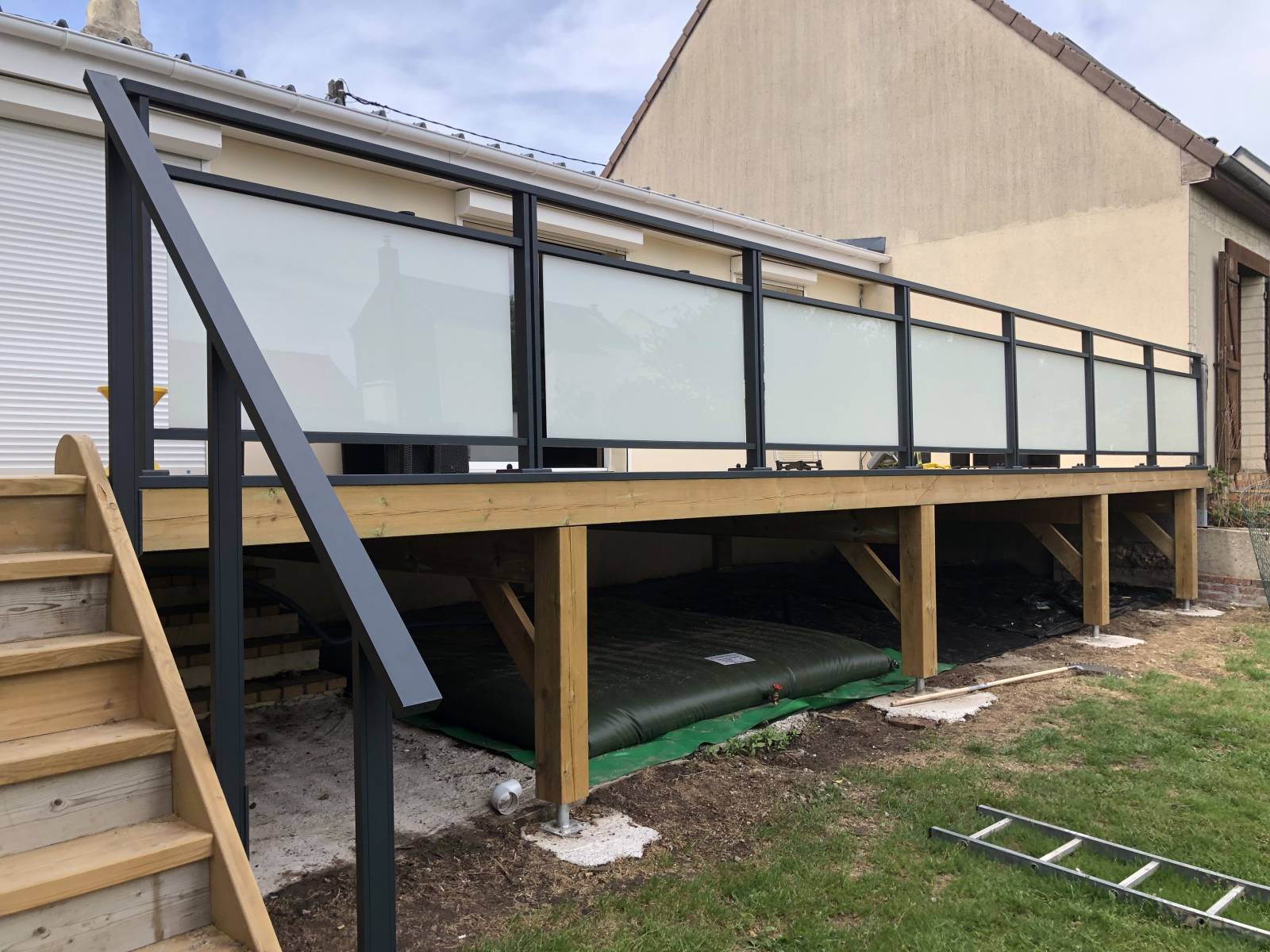 Cette ensemble composé de lames de terrasses bois essence pin et d'un garde corps en aluminium gris 7016 vitré opale est très apprécié pour son esthétisme.