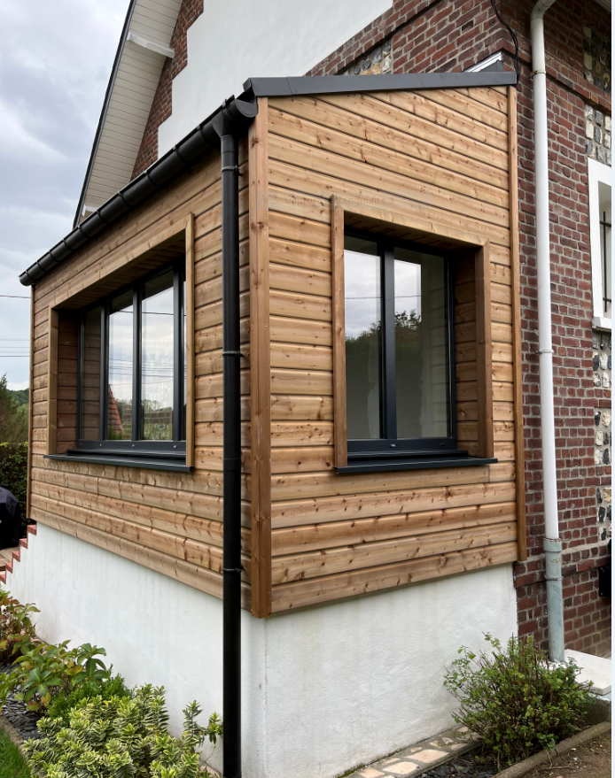 Ce modèle avec son bardage sapin traité classe 3 coloris marron, sa couverture de type bac acier et ses menuiseries en pvc de couleur gris anthracite s'harmonise parfaitement avec le style de la maison.