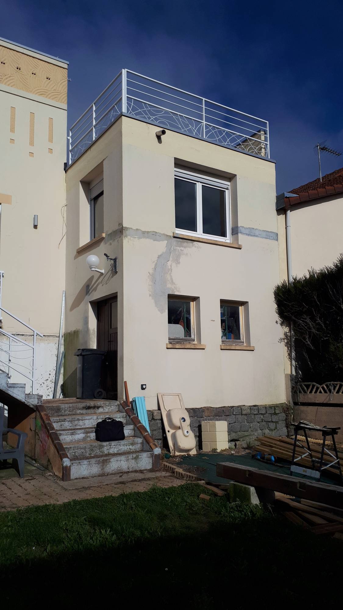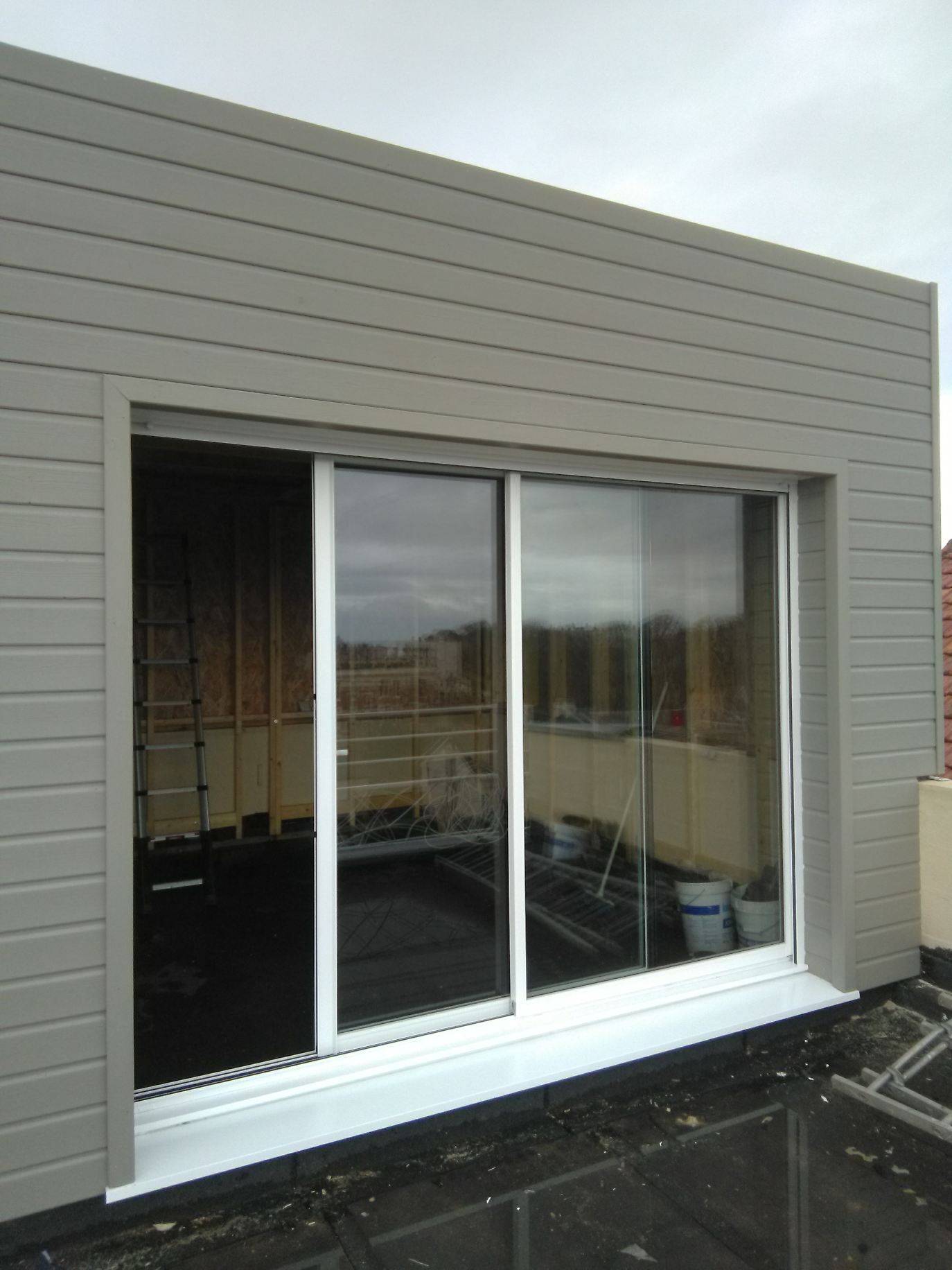 Sur ce projet, notre client souhaiter rajouter une chambre supplémentaire à sa maison par le biais d'une surélévation d'environ 16 m² - Le coulissant est en aluminium blanc avec un volet roulant intégré et manoeuvre éléctrique radio.