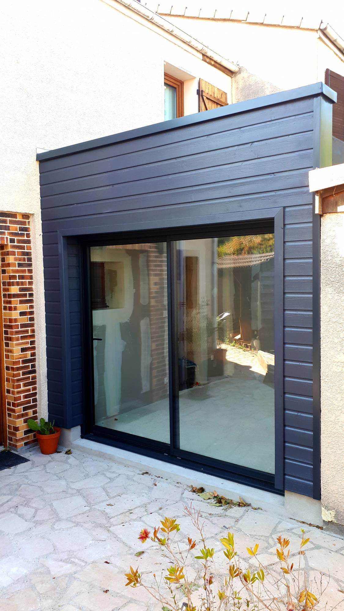 Remplacement d'une véranda par une construction ossature bois avec bardage bois graphite et menuiserie en aluminium monocouleur alu 7016. A titre indicatif, budget inférieur à 20 000 €.